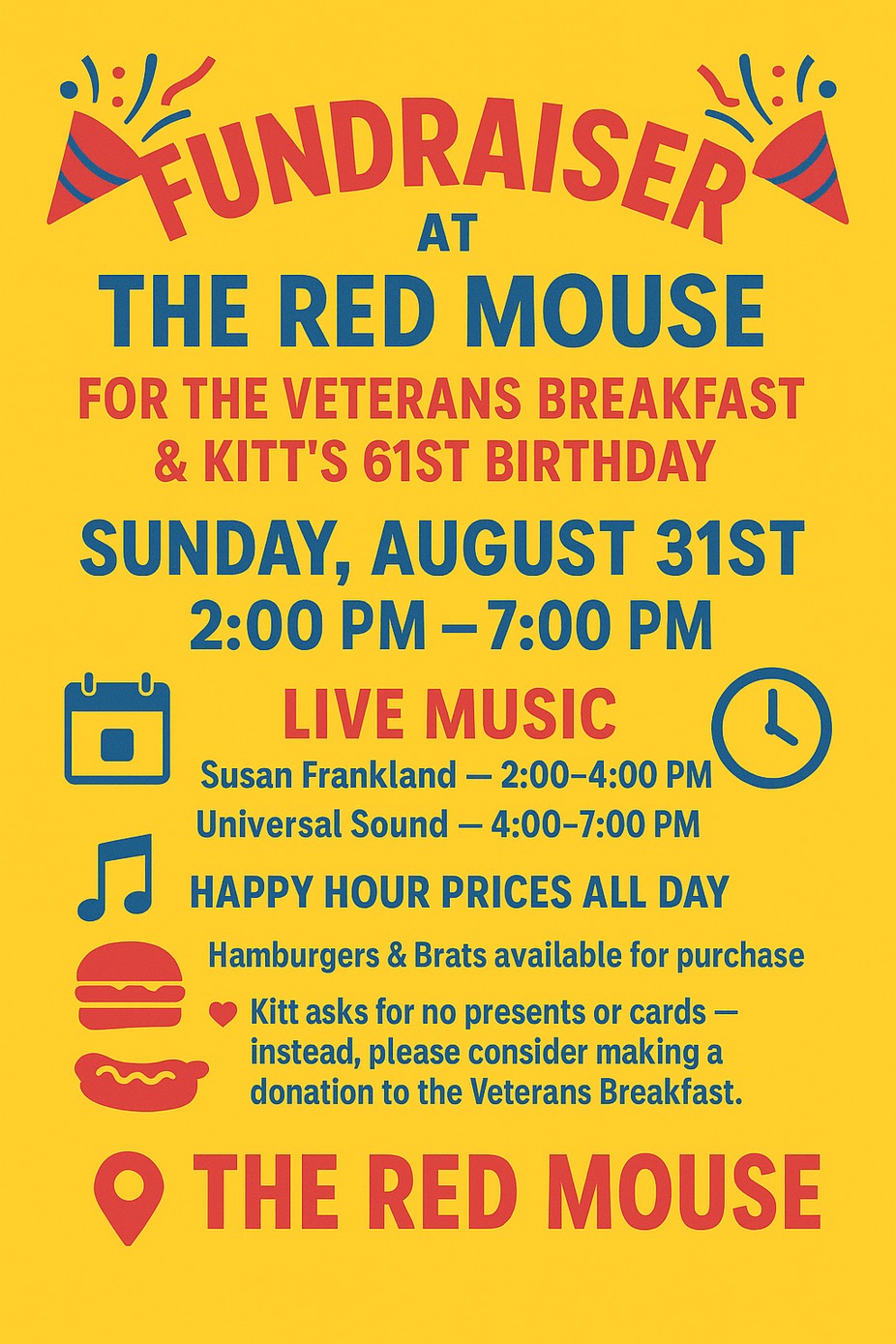 If you are a vet or know one; bring them out to The Red Mouse for breakfast the first Saturday of every month! Vets eat for free thanks to the donations of so many people.08:30 AM - 11:00 AM